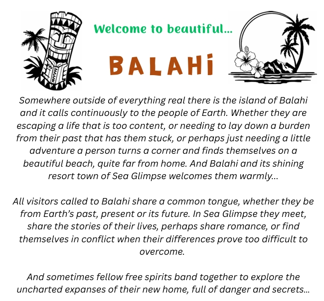 Somewhere outside of everything real there is the island of Balahi and it calls continuously to the people of Earth. Whether they are escaping a life that is too content, or needing to lay down a burden from their past that has them stuck, or perhaps just needing a little adventure a person turns a corner and finds themselves on a beautiful beach, quite far from home. And Balahi and its shining resort town of Sea Glimpse welcomes them warmly...